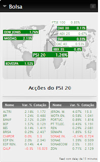 Todos os dias (menos ao fim de semana e feriados, obviamente!) vou várias vezes ao site do Económico e adoro ver a bolsa! Aqueles índices e acções a piscarem como se fossem luzinhas de natal! E só por ali já é bem perceptível perceber como vai a economia mundial, se há notícias favoráveis ou desfavoráveis: